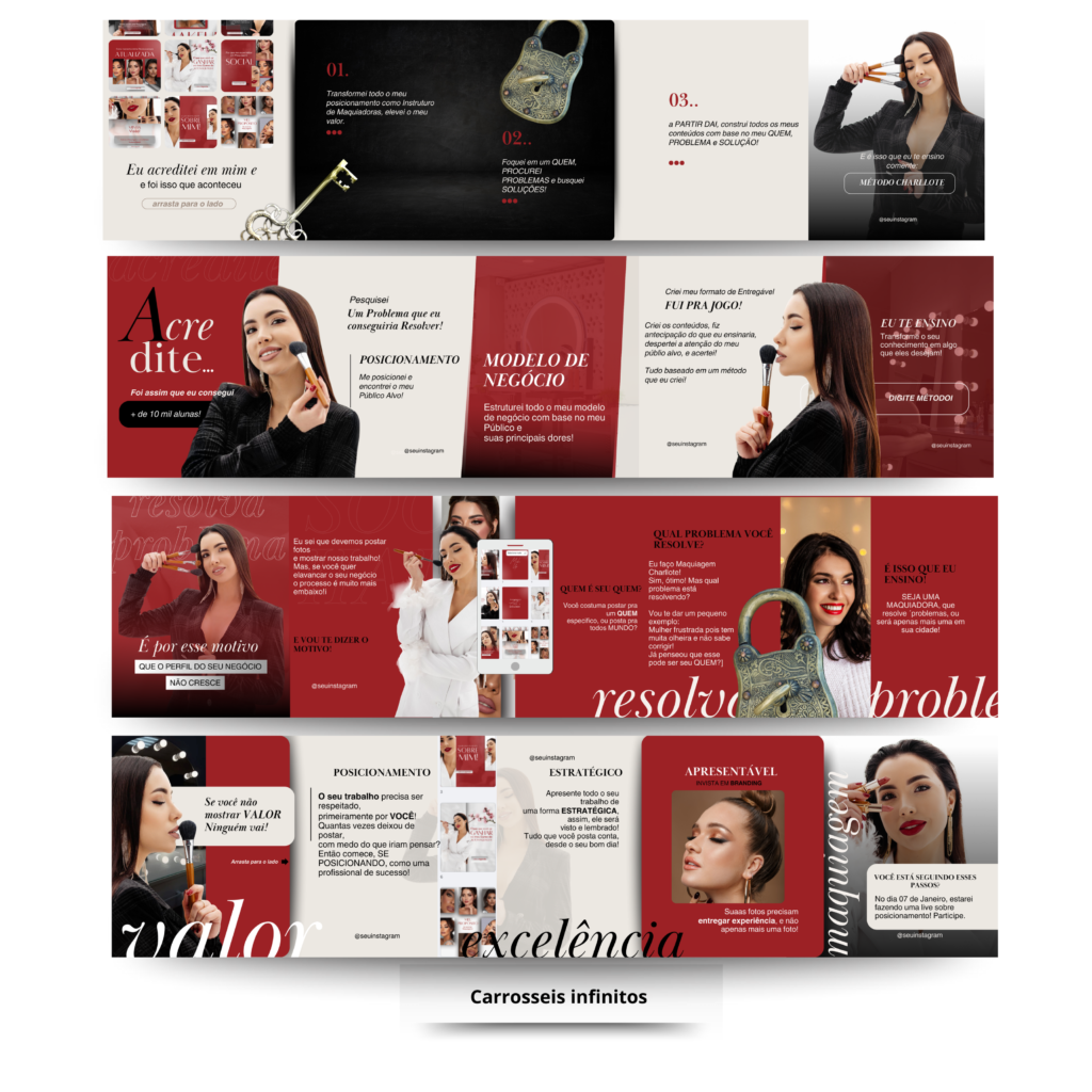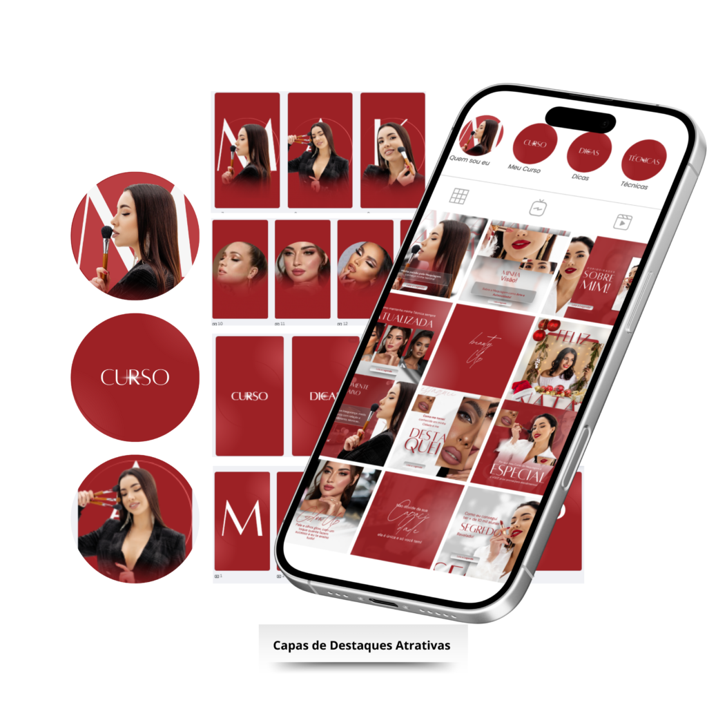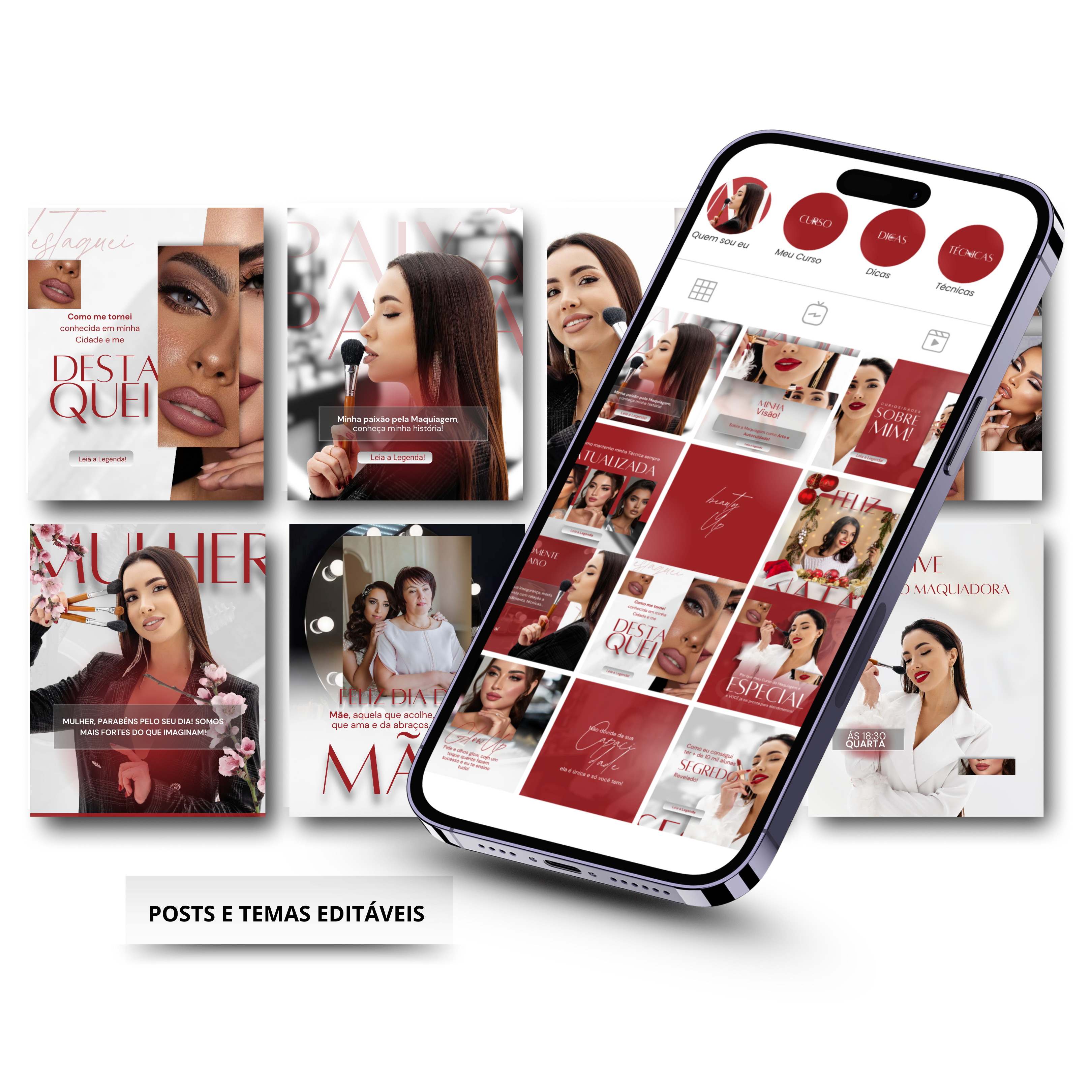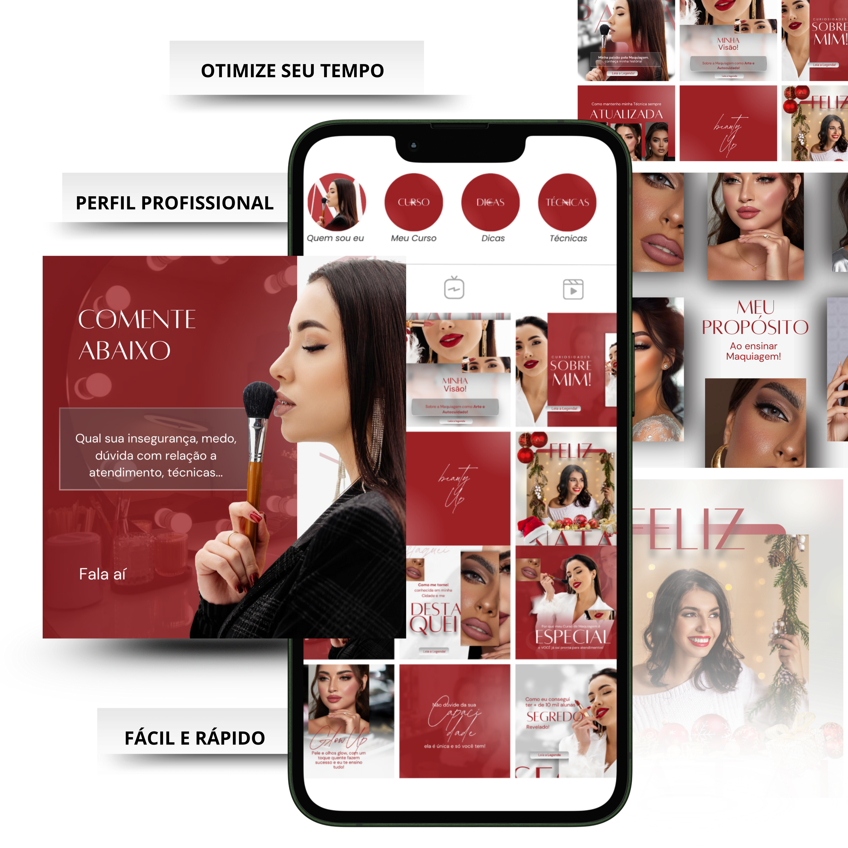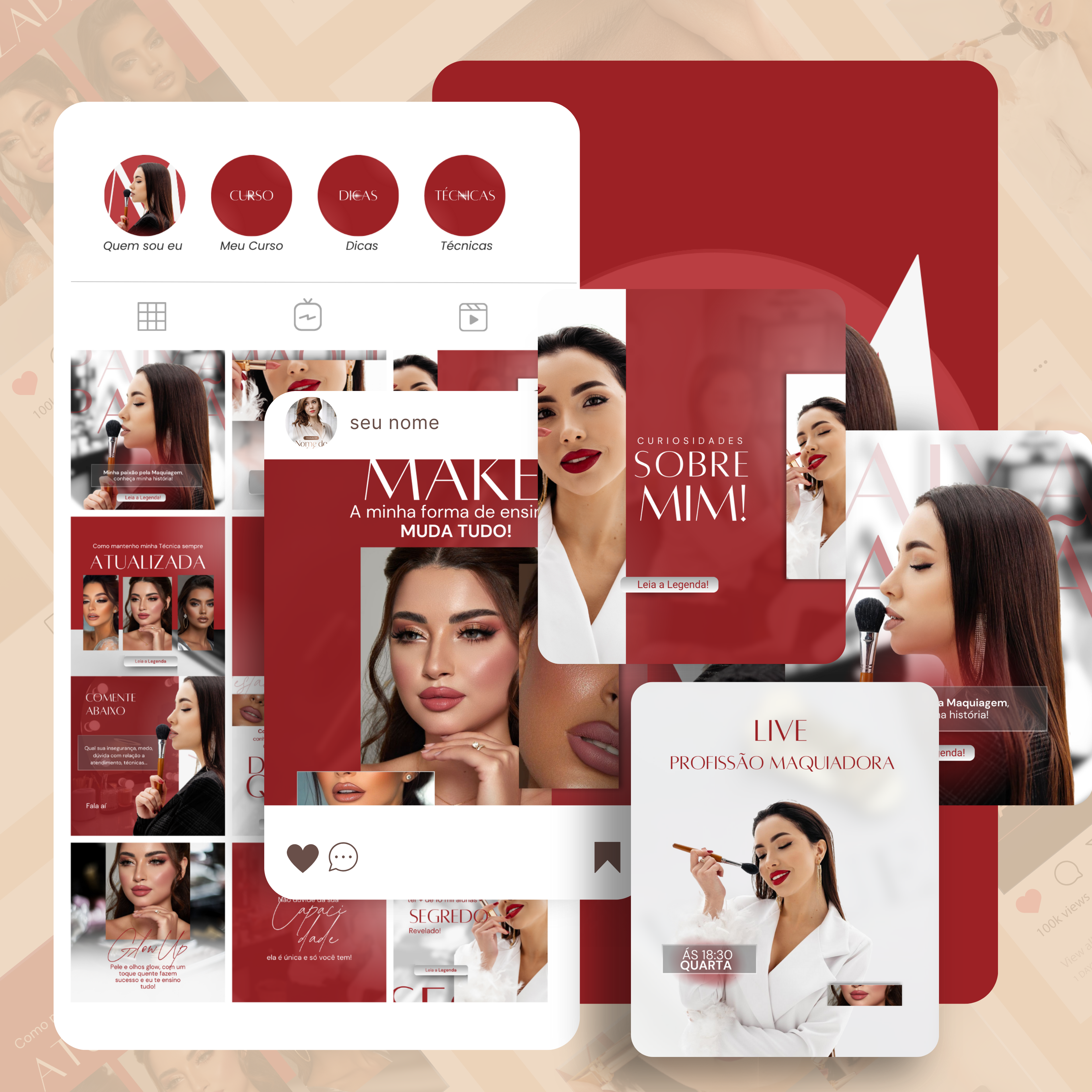 Cada arte foi criada pensando nas necessidades específicas de maquiadoras que atendem e ministram cursos e desejam elevar sua presença digital. Você só precisa: